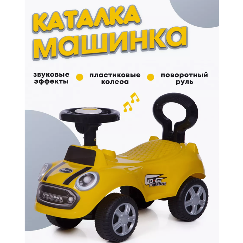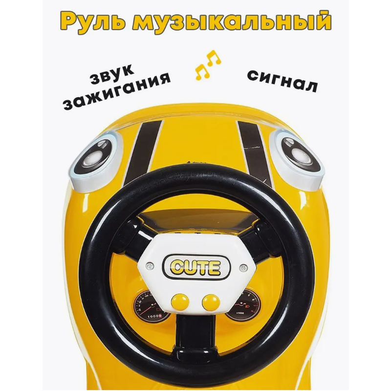 Каталка миникар порадует вашего ребенка поворотным рулем, на котором располагаются кнопки со звуками.
