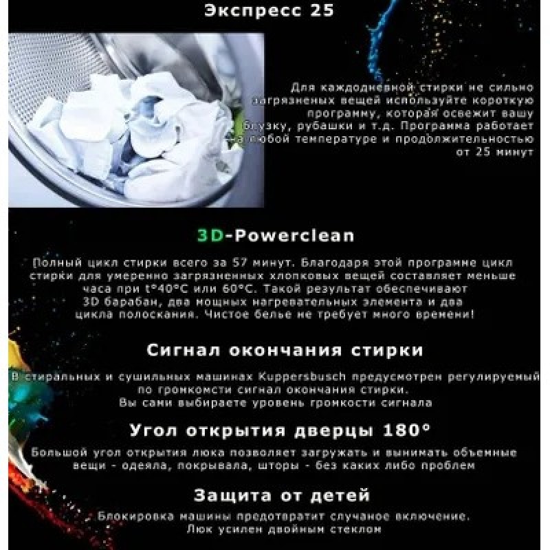 Стиральная машина Kuppersbusch W 20.0 W белаяПрограммы/дополнительные программы:Программы стирки от 20 до 90°C (2 нагревательных элемента) Программы экспресс-стирки на любой температуре длительностью от 20 минут Стандартные программыХлопок, Хлопок 3D-Powerclean, Легкий уход, Ручная стирка, Шерсть, Шелк, Тонкое белье, Смешанная стирка, Быстрая стирка 15 минут, Сорочки/Блузки, Разглаживание, Спортивная одежда, Джинсы, Шторы, Пропитка, Детское белье, Автоочистка (Программа очистки машины)Программы ECO Хлопок, Легкий уходДополнительные функцииЭкспресс, Предварительная стирка (пятна), Уменьшение температуры, Скорость отжима, Остановка полоскания, Замачивание3D стирка - это возможно !Особенности оснащения: Большой цветной дисплей 4.3“Ребра барабана для 3D-Стирки (технологии 3D-Washing)Шумоизоляция: Silent PlusСветодиодная подсветка барабанаДатчик регулирования загрузкиИндикация хода программы и времени до окончания программыОтложенный запуск – до 7 днейИндивидуальные настройки: например, дополнительный цикл полосканияРегулируемый по интенсивности акустический сигнал окончания программыБак из нержавеющей сталиУгол открывания люка – 180°, диаметр люка – 34 смВозможность перенавески люка (правая/левая)Хромированный люкЗащита от детей, двойное стекло люкаСистема защиты от протечки Aquastop / Контроль пенообразованияКомпенсация дисбалансаИндикация подачи / слива водыОбзор специальных программУличная и спортивная одеждаЭта группа программ подходят для стирки одежды для различных погодных условий, курток для спорта и отдыха, а также современных тканей из микрофибры или с высоким содержанием микрофибры, например, GoreTex или SympaTexУход за домомПрограммы группы «Уход за домом», для которых используется большой объем воды и низкая скорость отжима, хорошо подходят для стирки изделий бытового назначения из смешанного типа ткани и синтетикиОдежда для бизнесаНемнущиеся рубашки и блузки, как правило, можно не гладитьАнтибактериальная обработкаПрограммы группы «Антибактериальная обработка» позволяют уничтожить большинство вредных для здоровья микроорганизмов и клещей , а также эффективно вымывать аллергены из тканейОбзор дополнительных программЭкспрессДанная дополнительная программа предназначена для бережной стирки слегка загрязненного белья. Снижает потребление электроэнергии и продолжительность программы стиркиПредварительная стиркаДля особо загрязненной одежды, сложных пятен (кровь, пятна от белка и пр.), а также для рабочей одежды.Температура стирки: 30 °CИнтенсивная стиркаПрограмма предназначена для сильно загрязненного белья, особенно с пятнами, которые необходимо отбеливать (например, от фруктов, кофе, чая, красного вина, масла). Длительность цикла стирки увеличиваетсяТемператураТемпературу стирки можно поэтапно уменьшать с шагом 10 °C. Текущая температура отображается на дисплееСкорость отжимаУменьшение скорости отжима обеспечивается бережное отношение к деликатному белью. Текущая скорость отжима отображается на дисплееОстановка полоскания (режим «Без отжима»)Дополнительная программа остановки полоскания позволяет избежать образования складок на деликатном белье, оставив его в последней воде для полосканияЗамачиваниеПосле нажатия кнопки запуска программы начинается отсчет времени замачивания; оставшееся время до запуска прог